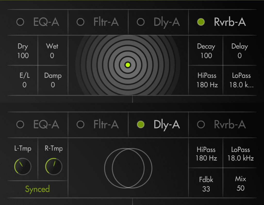 Built-in FX Suite: Delay with tone shaping, and reverb with cutoff.